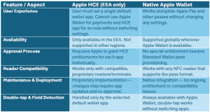While Apple has enabled Host Card Emulation (HCE) support for third party apps in the EEA, there are significant differences and limitations compared to using the native Apple Wallet: